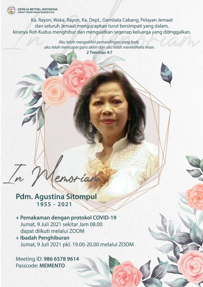 Telah pulang ke rumah Bapa di Sorga, Pdm Agustina Sitompul, pada hari Kamis, 08 Juli 2021 sekitar pukul 16.30 di Rumah Sakit Hermina Yasmin, Bogor.