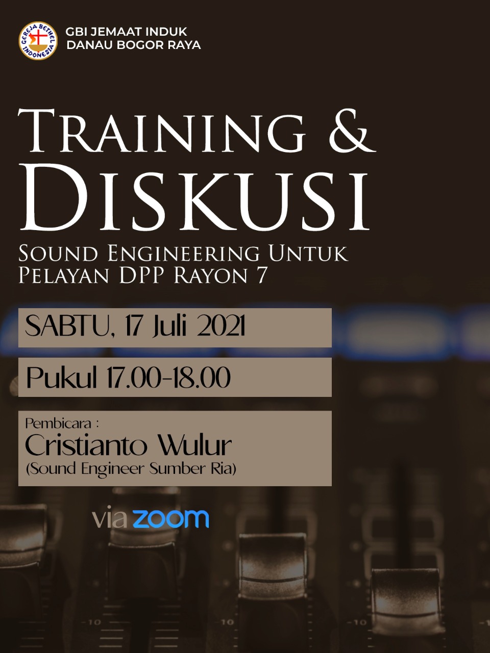 Training dan Diskusi Sound Engineering untuk Pelayan DPP R7 bersama Cristianto Wulur (Sound Engineer Sumber Ria) diadakan pada hari Sabtu, 17 Juli 2021 pukul 17:00-18:00 via Zoom #r7meet.