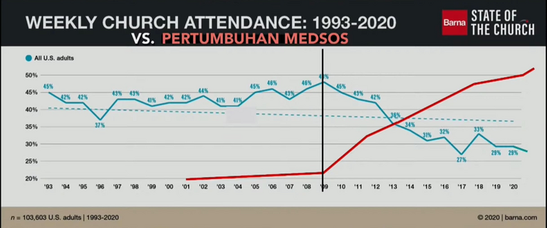 Sementara media sosial pertumbuhannya dari tahun 1993 sampai tahun 2020 (angka yang didapat dari Barna Research), grafiknya berbanding terbalik dengan kehadiran mingguan dari gereja Tuhan di Amerika Serikat. Kehadiran di gereja itu menurun drastis, Saudara.